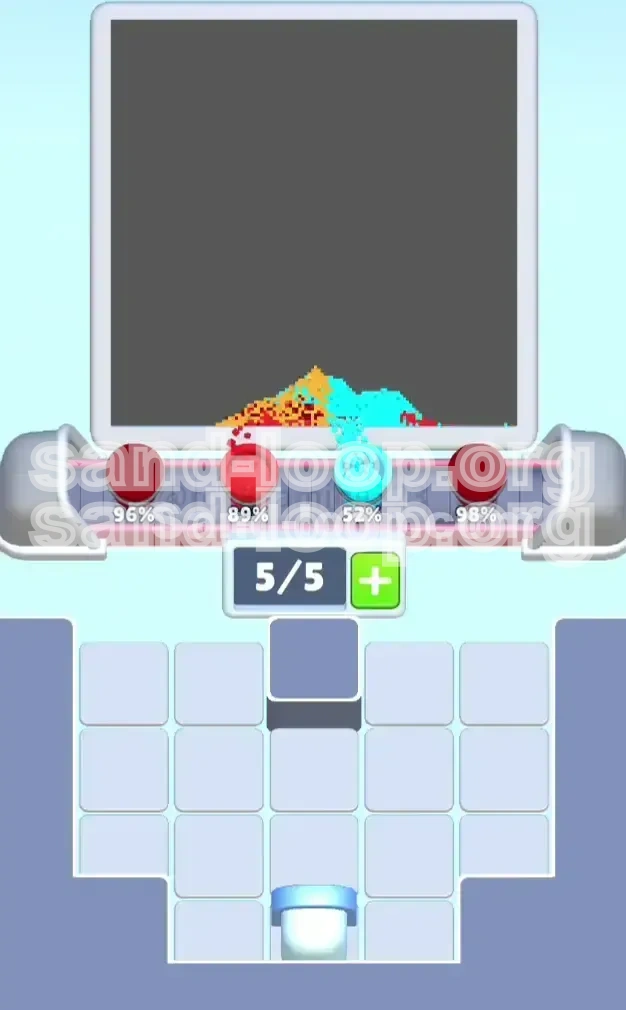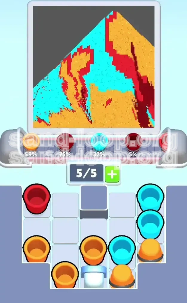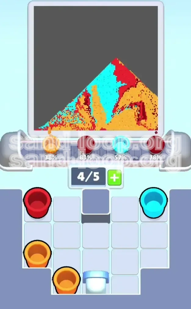 "Sand Loop" marks a transition from "Twitch" gameplay to "Rhythmic" gameplay. In earlier levels, pure clicking speed could overcome poor planning. Here, speed without direction is fatal. The game introduces a psychological trap: the "Panic Fill." When players see the sand filling up slowly, they tend to spam yellow cups, inadvertently clogging the belt and causing a gridlock when the Red and Maroon cups finally spawn. This level requires you to suppress the urge to click rapidly and instead execute a calculated sequence of moves.