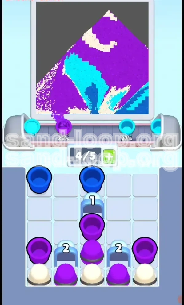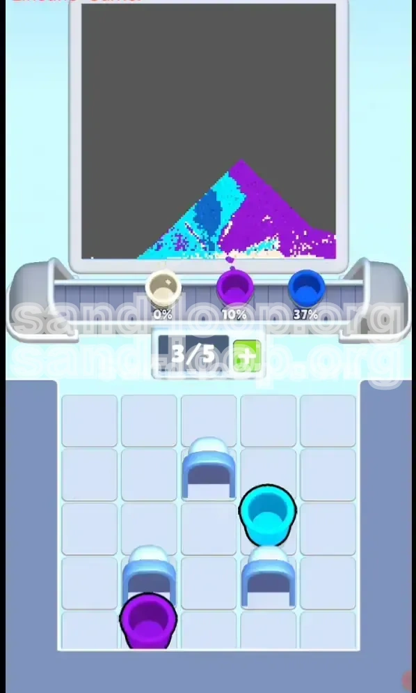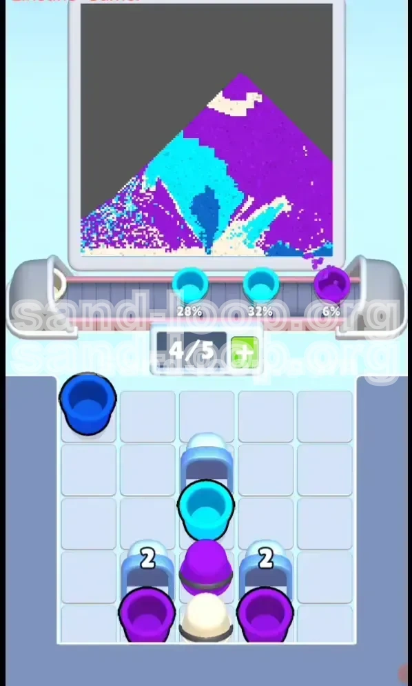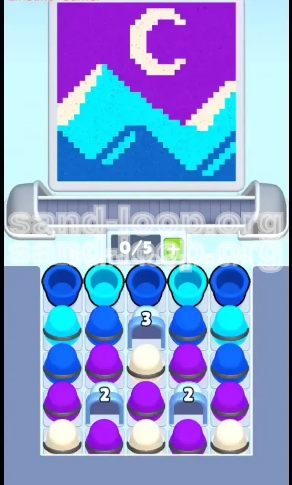 Welcome to the ultimate walkthrough for Level 107, "The Moonlit Mountains." This stage is a significant difficulty spike in Sand Loop, testing your ability to manage resources and plan. Unlike standard levels where you can simply tap the top cup, Level 107 requires you to think like an archaeologist. You are not just painting; you are digging. The challenge lies in the fact that the color you need the most (Purple for the sky) is buried at the very bottom of the stack, protected by complex countdown gates.