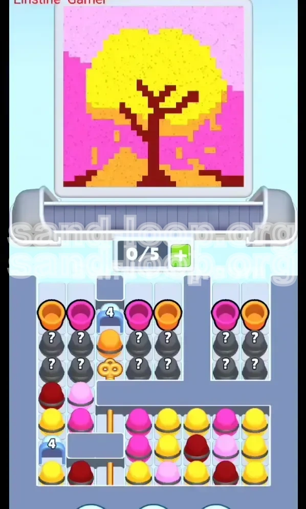The game baits you with a specific resource imbalance. You will see an abundance of Pink cups in the tray immediately. The trap is assuming that because there are more Pink cups available, you should process them first. This is incorrect. The sand dispenser logic prioritizes large contiguous pixel blocks. It will attempt to paint the Yellow canopy before it touches the Pink sky. If you fill your belt with Pink cups early, they will cycle endlessly on the conveyor, wasting slots and blocking you from picking up the necessary Yellow cups.