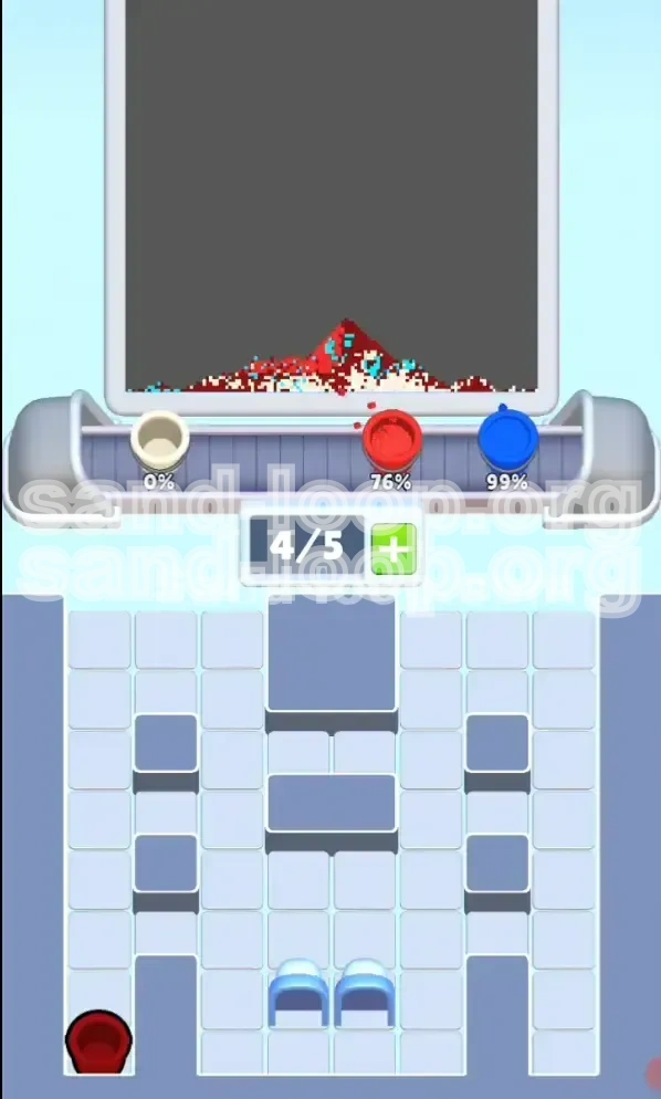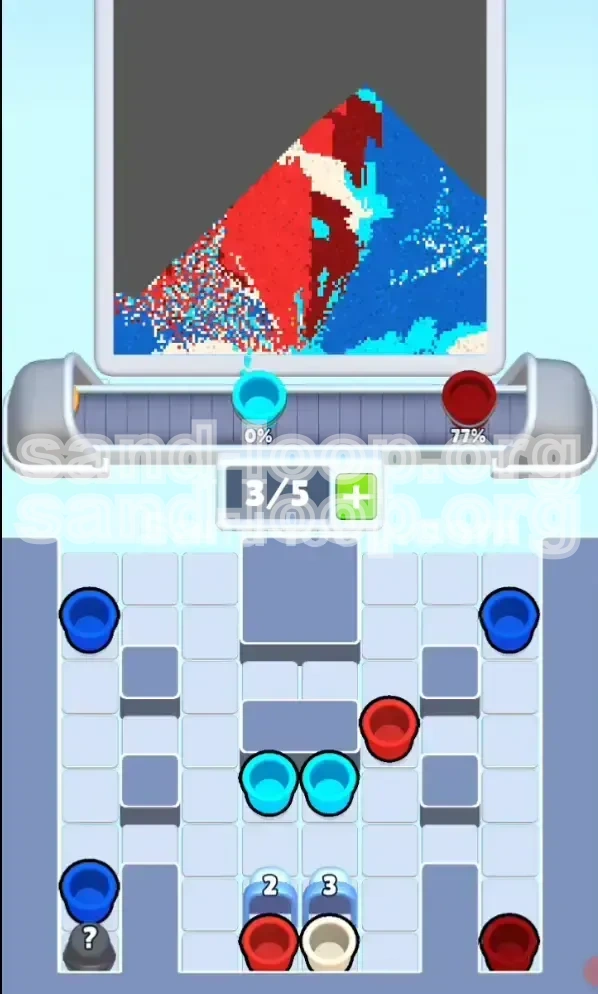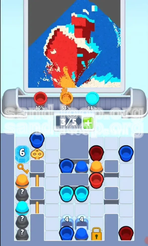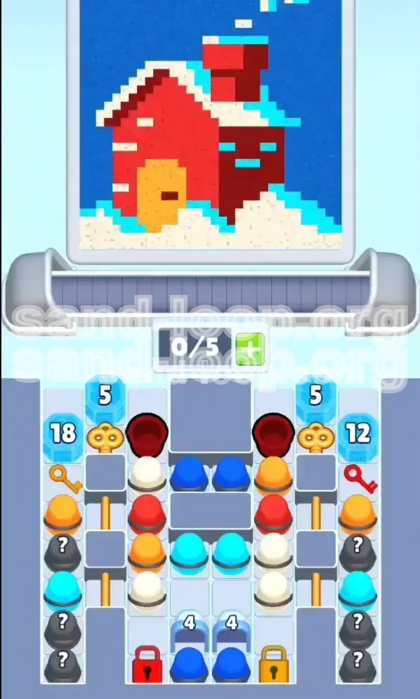 Sand Loop Level 120 presents a deceptively simple pixel-art house set against a deep blue night sky. The canvas is divided into five distinct color zones that require precise filling: a large Deep Blue background, a Vibrant Red house structure, Cyan window accents, Cream-colored walls, and a Golden door detail. The challenge lies not in the variety of colors, but in the strict capacity limits of your conveyor system relative to the size of these zones.