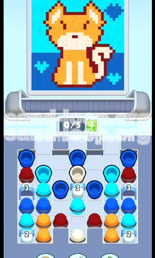 This level is designed to punish impulsive players. The most common colors (Cyan and Dark Blue) are visually dominant and appear frequently in the supply tray. However, the game logic requires you to ignore them for large portions of the level. The "Color Trap" is the temptation to clear the board of easy colors first, which inevitably leaves you with a full conveyor of useless sand while the fox's face (Cream) remains unpainted. Success in Level 144 requires prioritizing the rare colors over the abundant ones.