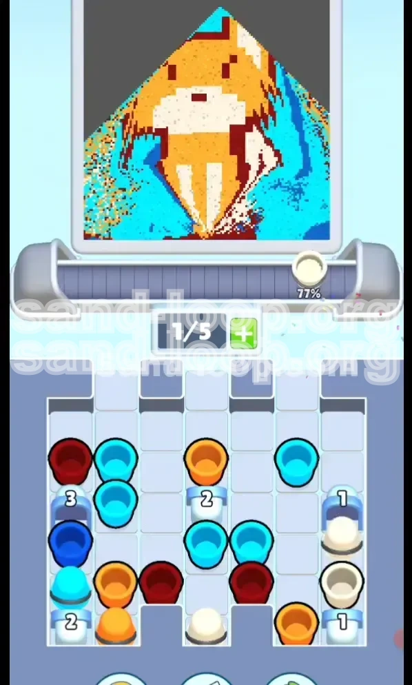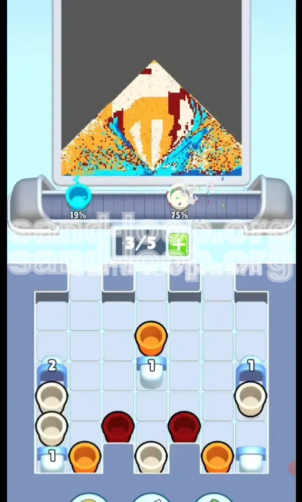 Once the 5th cup is loaded, you have no control left. Watch the final pours. If you selected correctly in Phase 4, the final sand stream will hit the canvas and trigger the "Level Complete" explosion just as the meter hits 100%. If the level fails, note which color was the lowest—that was the color you should have prioritized in Phase 3 or 4.