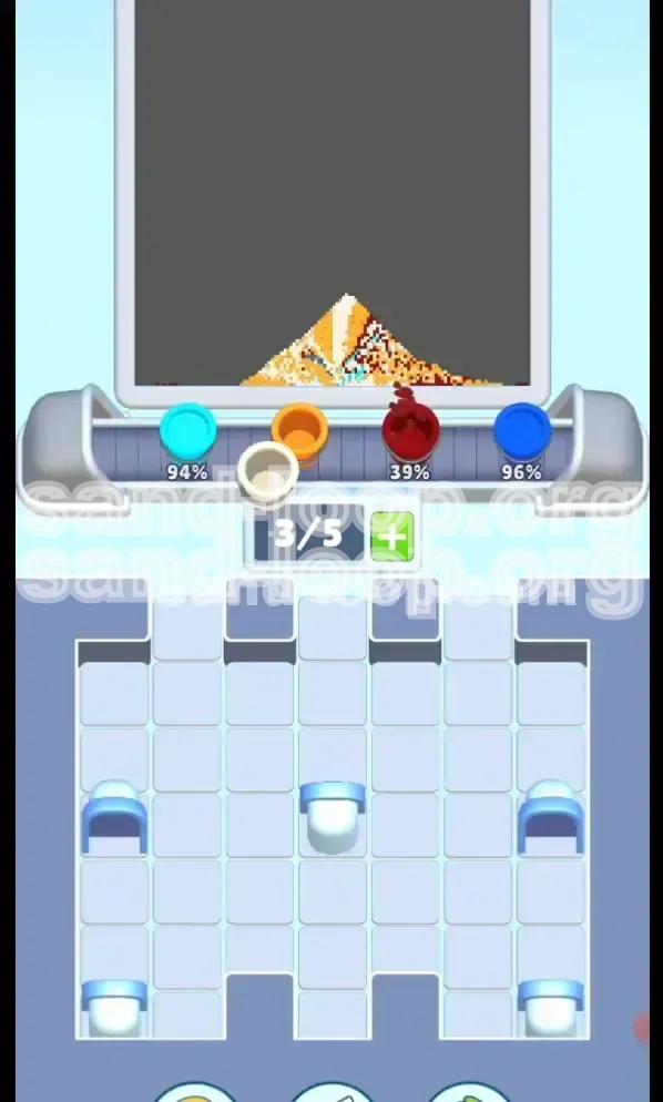The dispenser for this level behaves with a consistent rhythm. There is a fixed travel time of approximately 2 to 3 seconds between loading a cup onto the conveyor belt and the moment the sand actually hits the canvas. This mechanical delay is the primary source of failure for most players. Because you cannot cancel a pour once the cup is loaded, you must anticipate your needs three seconds in advance. The challenge is not just identifying the right color, but identifying it *before* the previous pour has even finished settling.