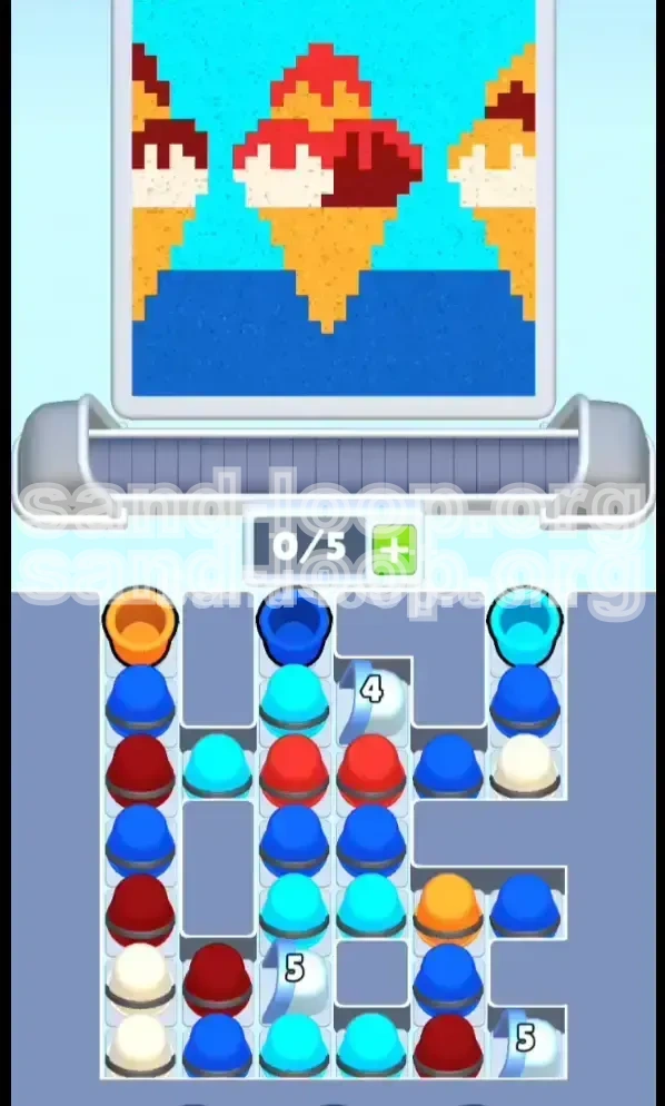 Welcome to the most deceptive level in Sand Loop. At first glance, Level 157 looks like a casual, summer-themed stage featuring three delicious ice cream cones. However, do not be fooled by the vibrant pixel art. This level is a rigorous test of logic and supply management rather than speed. The core difficulty lies in the "Cyan Trap"—a layout designed to tempt you into ruining your canvas before you have even begun.