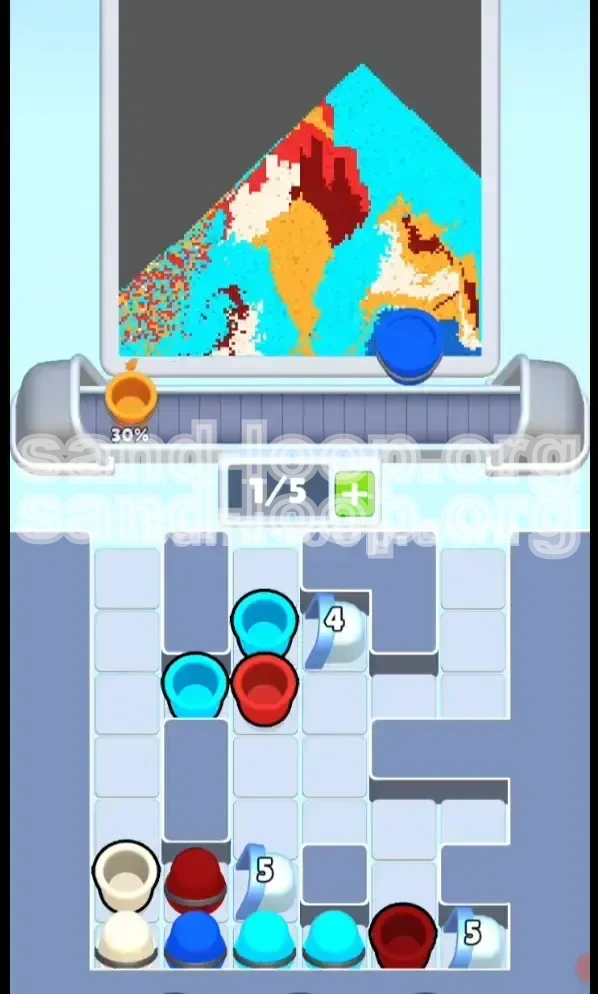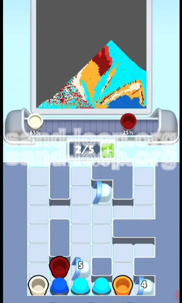 - The Center Column Spam: Tap the center stack rapidly. Since the bottom and middle of the canvas are already filled with heavier Blue, Orange, and White, the Light Cyan sand has nowhere to go but up.