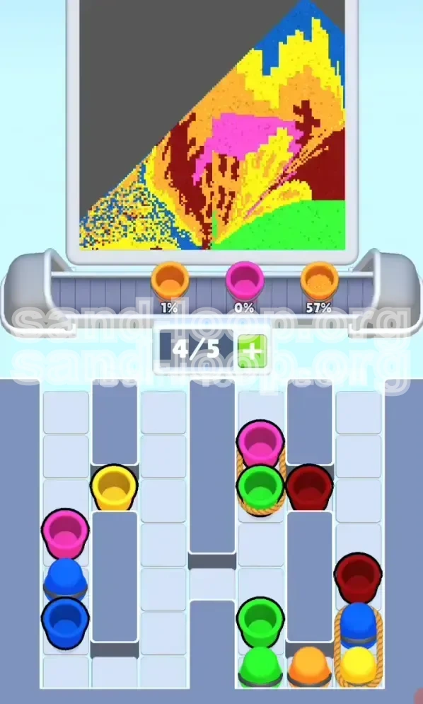 The Rope Bond is the central antagonist of this level. When you see a rope connecting two buckets, the top bucket acts as a "lock." You physically cannot select or interact with the bottom bucket until the top one has been moved to the conveyor belt. This creates a "cost" for every move. For example, to get a Red bucket (which you need for the trees), you might first be forced to spend a move clearing a Green bucket above it. If the sand dispenser is currently pouring Red, this is perfect. But if the dispenser is pouring Blue, that Green bucket you just pulled becomes "junk" clogging your belt. You must calculate if you have the time and space to pay the "cost" of untying the rope for every single move.