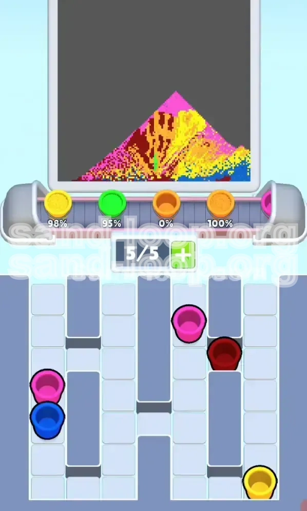 - The Green Lawn (Bottom 20%): This is the foundation of the painting. It requires a massive volume of green sand. The challenge here is that the Green buckets are trapped in the middle columns of your supply tray, obstructed by Pink and Blue buckets.