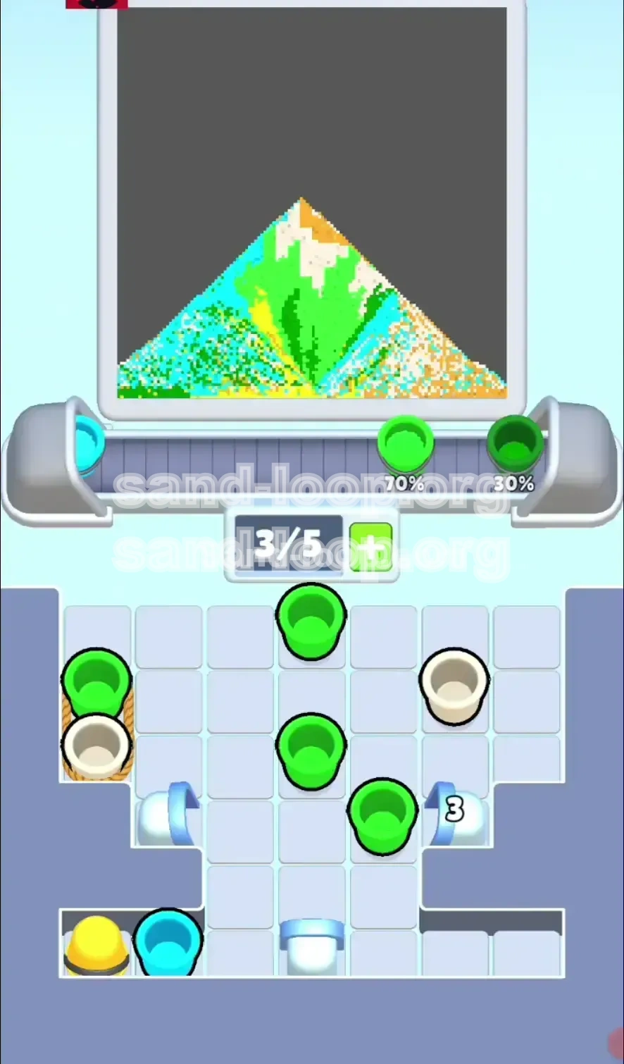 Do not treat colors equally. You must prioritize the "Base Colors" (Greens) first. The "Detail Colors" (White, Orange) must be queued on the belt but protected from being filled until the correct moment. Ideally, you want White cups arriving on the belt just as the sand pile reaches the rabbit's head level.