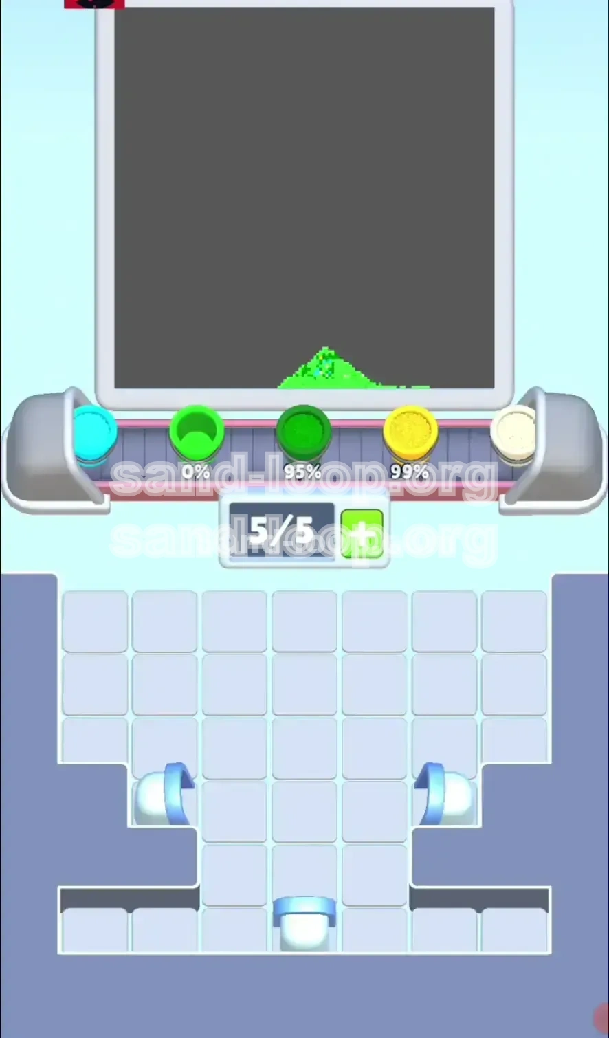 - The Error: You have a White cup on the belt, but the dispenser is pouring Green. You accidentally place the White cup on the canvas, filling a white rabbit pixel with green sand. Now the rabbit has a green smudge.