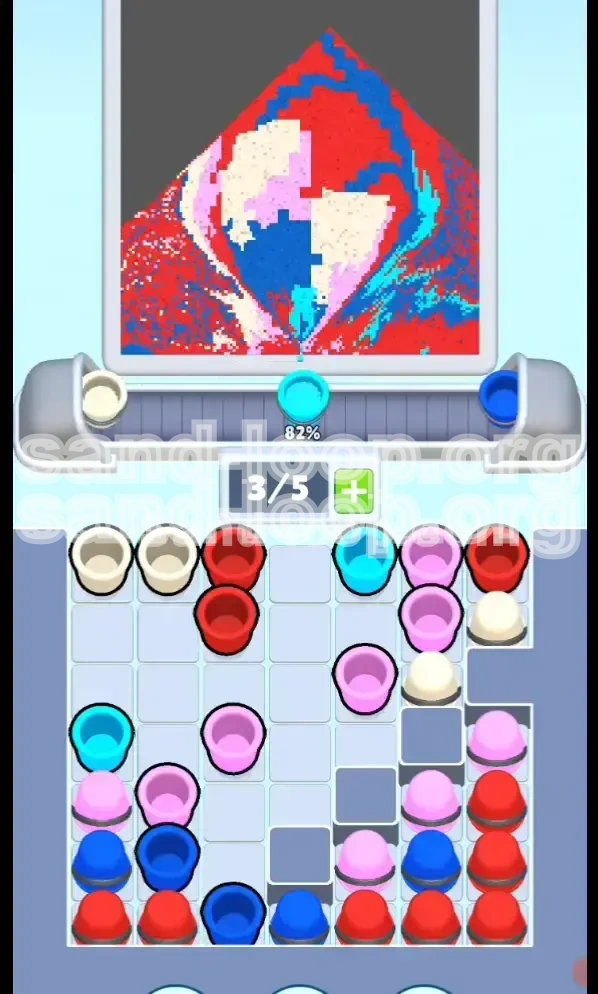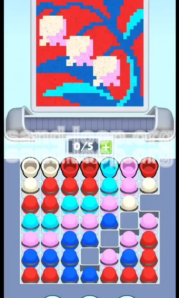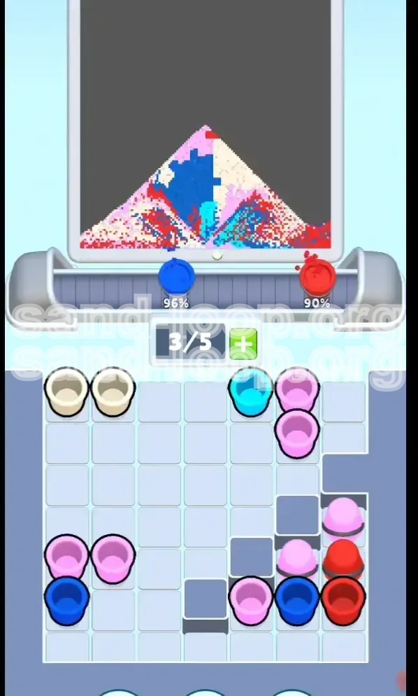 Why do players fail here? It comes down to the "Pink and Cream Trap." These two colors have the smallest surface area on the canvas but are scattered in multiple tiny spots. Because the sand pours automatically when the cup hits the trigger zone, you cannot micro-pour. It takes about 1.5 cups of cream and 2 cups of pink to finish the level. If you accidentally pour 3 cups of pink because you were focused on red, you lose. The margin for error on small colors is less than 10% overfill.