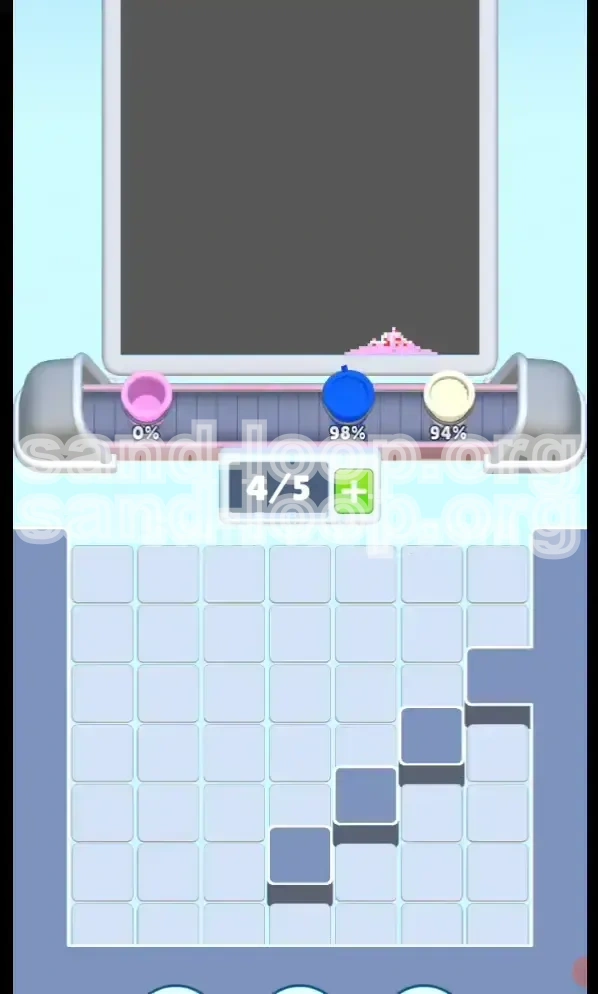 If your tray is full of Pink but Pink is already at 100%, you must clear the tray. Load the Pink cups onto the belt and let them overflow/waste. It feels wrong to waste sand, but a clogged tray is a death sentence. Clearing the "trash" cups allows new, necessary colors to spawn into the tray.