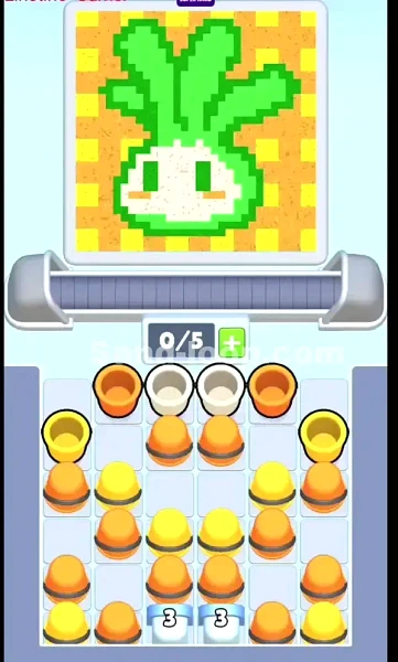 The difficulty in Level 180 stems from the "Warm Color Trap." Because yellow and orange cups are plentiful and often stacked on top, there is a natural tendency to load them first. However, the background requires a precise 50/50 split of these colors. If you over-pour orange early, you will run out of background space for yellow, forcing a reset. Furthermore, the green cactus requires vertical precision, and the cream face needs careful isolation to avoid muddying the green edges.
