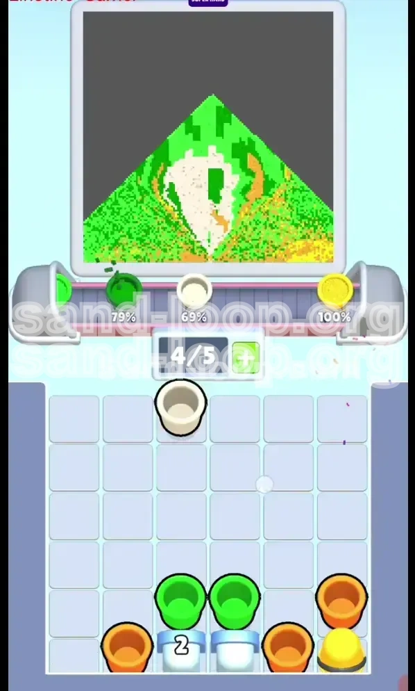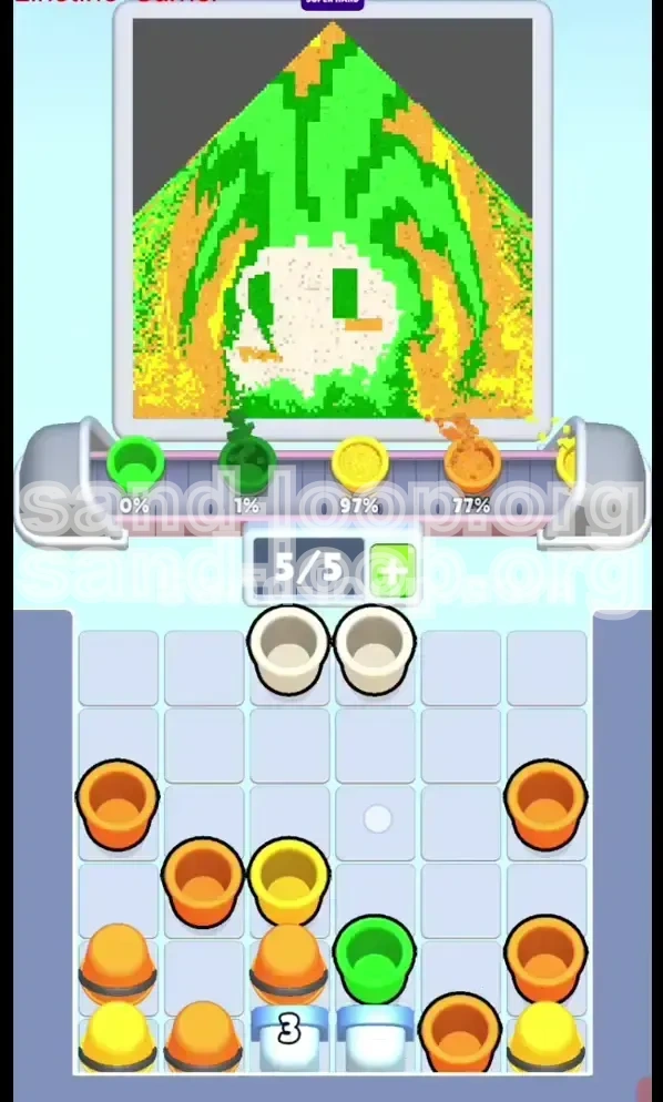 If you find that your Yellow sand is bleeding into Orange squares or vice versa, it usually means you are pouring too aggressively or from too high an angle. **Solution:** Slow down your pour speed. Move your cursor/finger closer to the specific square you are targeting. Use short taps instead of a continuous stream. If the bleed has already happened, you may need to restart, as overlapping colors cannot be separated.