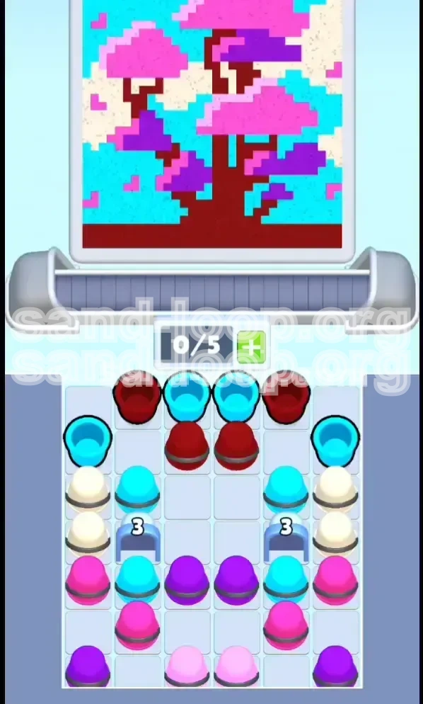 Level 182 in Sand Loop introduces a deceptive asymmetry that breaks the rhythm of standard "fill" levels. Unlike previous stages where colors are evenly distributed, this level features a massive dark-red trunk and a sprawling canopy that heavily favors Cyan and Magenta. The primary difficulty here isn't just the volume of paint required, but the physical obstruction of your supply tray. You are not fighting the timer; you are fighting the "deadlock" created by useless filler cups blocking your essential colors. The stage requires a mental shift from reactive tapping to predictive planning.