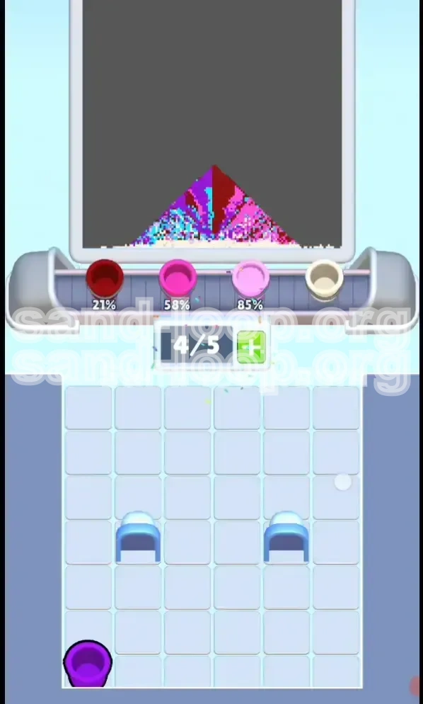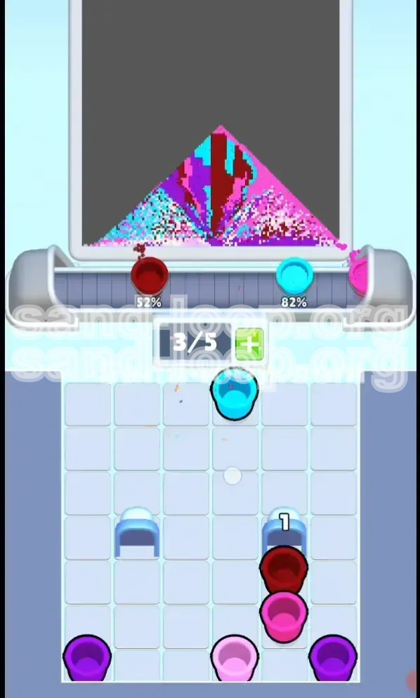 Victory is achieved when the progress meter hits 5/5 distinct colors. However, because of the volume disparity, you can easily "max out" Cyan (overfilling it to 100% while other colors lag at 30%). The true win condition is a *balanced* fill: reaching near-completion on Cyan simultaneously with the completion of Purple and Dark Red. If Cyan finishes too early, you will run out of conveyor space trying to scrape together the last bits of Purple.