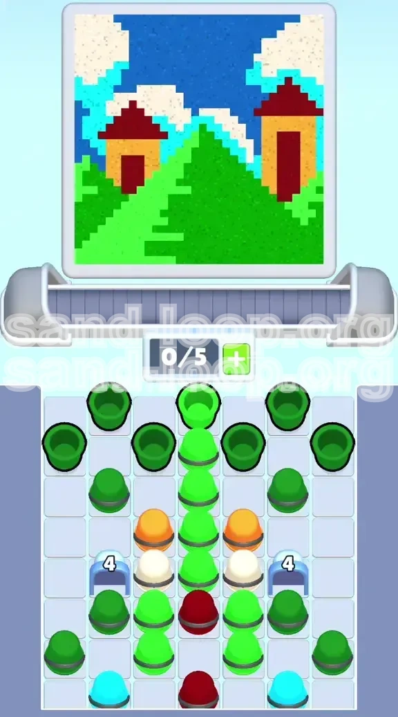 Level 186 presents a deceptively complex puzzle disguised as a cheerful landscape painting. Your primary objective is to fill three distinct vertical zones: a top section dominated by Sky Blue and Cyan clouds, a middle section featuring Yellow houses with Dark Red roofs, and a massive bottom section consisting of a Lime-Green hillside. While the visual is simple, the challenge lies in the sheer volume imbalance between these colors. The Green zone accounts for approximately 60% of the total required paint volume, while the Cyan, Red, and Yellow details combined only make up about 25%. If you treat this as a standard "fill the board" level, you will fail. You must approach this as a resource management problem where you restrict the flow of the abundant resource (Green) to ensure the scarce resources (Red, Cyan, Orange) aren't stranded in the supply tray.