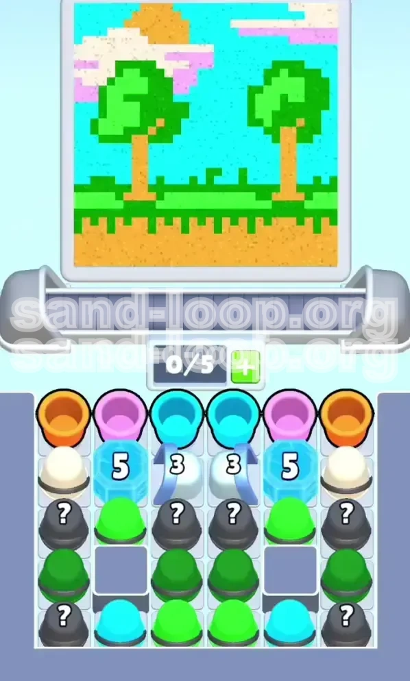 Sand Loop Level 30, titled "Pixel Park," presents a deceptive 8-bit landscape that tests your ability to manage vertical column logic rather than standard horizontal fills. The visual target is nostalgic: two vibrant green trees standing on a grassy hill against a cyan sky dotted with pink clouds.