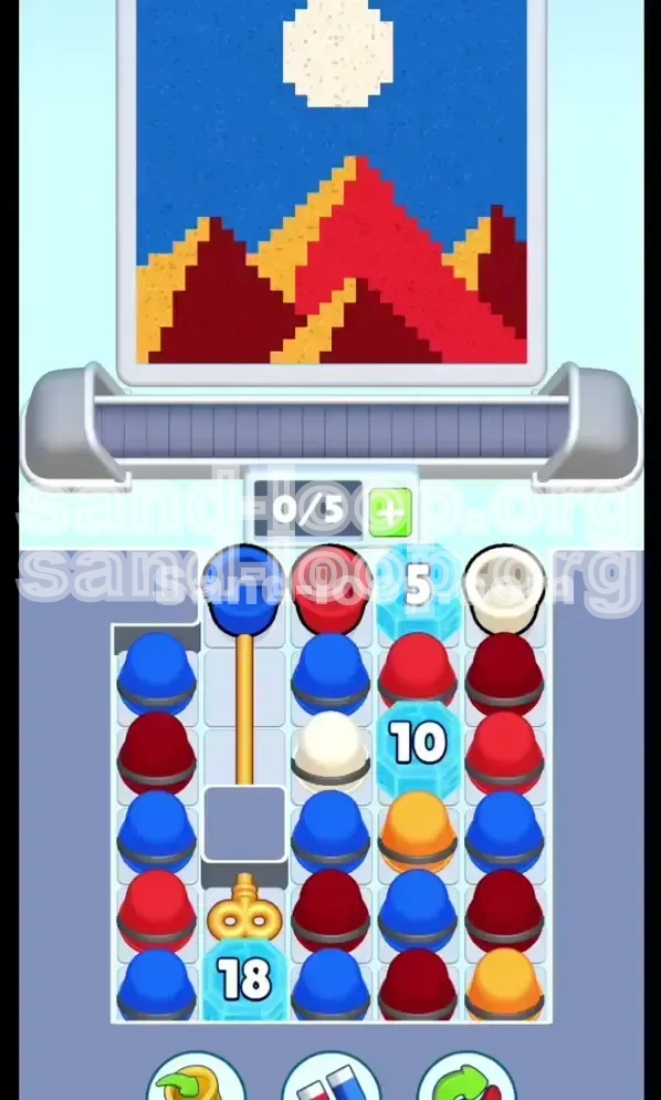 • The Ice Mechanics: This level introduces "Counter Ice." These blocks (marked 5, 10, and 18) do not melt by sand proximity; they shatter only after you have successfully processed a specific number of cups through the conveyor belt.