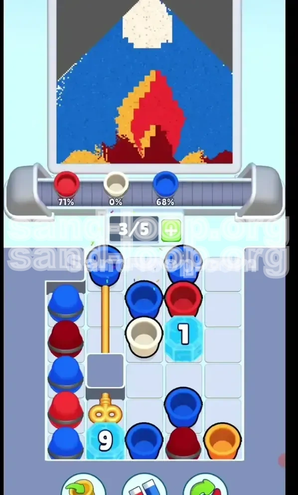 Why is this level hard? Because physics and logistics are fighting each other. If you try to paint the sky before the pyramids, the blue sand will fall into the empty red zones, creating a muddy purple mix that fails the level precision check.