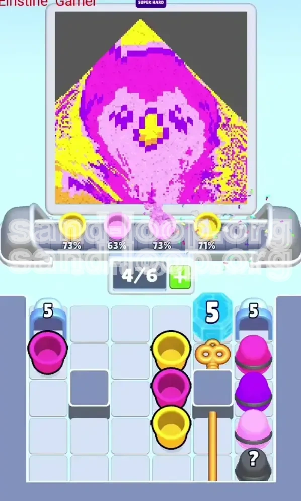 Pay close attention to the four progress bars at the top of the screen. - **Magenta (40% capacity):** This is your bulk work. It fills slowly but demands the most attention. - **Purple (30% capacity):** This is the bottleneck color. It is harder to access and fills up moderately fast. - **Light Pink (25% capacity):** This acts as a bridge between the other colors. - **Yellow (5% capacity):** The "Trap" meter. It fills instantly. One cup is roughly 80-100% of this requirement. Do not treat this like a normal color.