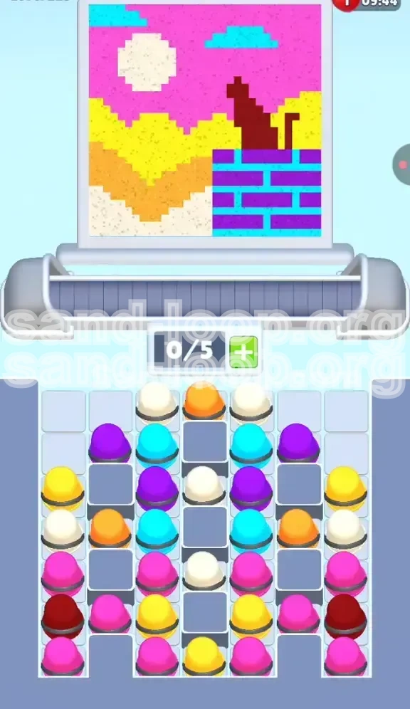 Your first major objective is to clear the White Sun and the majority of the Pink Sky. These colors occupy the largest surface area. Clearing them first serves a dual purpose: it completes the bulk of the image and, more importantly, drains the top layers of the tray to expose the colors buried underneath (specifically the Dark Red for the cat).