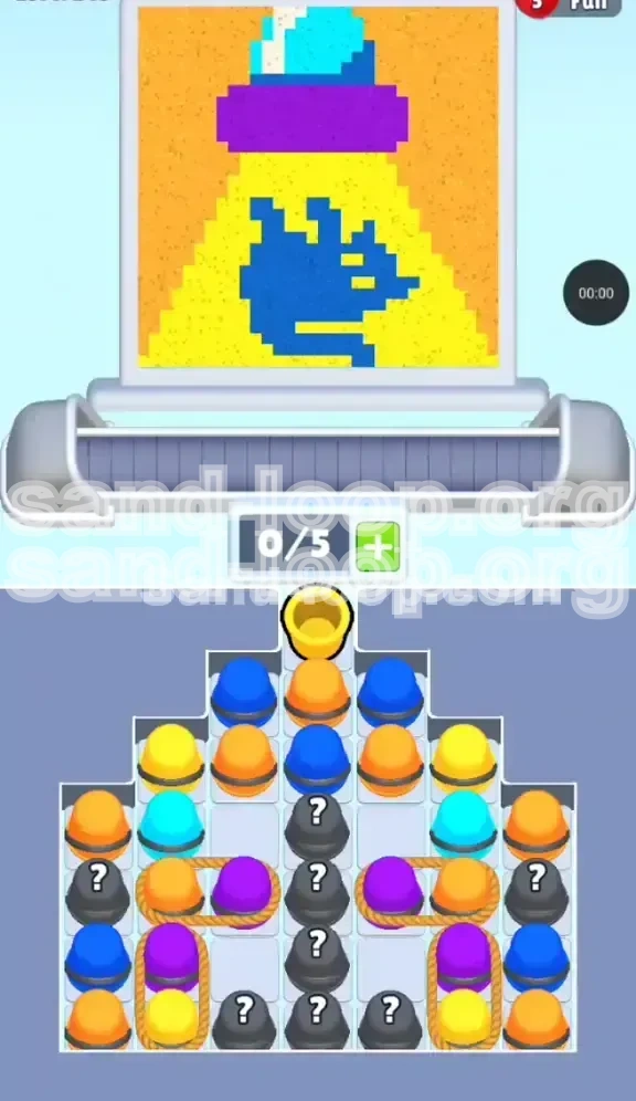 - The Rope Mechanic: Several Purple cups are tied to Orange cups. To get the Purple, you must accept the Orange. This effectively doubles the "cost" of that Purple sand in terms of belt space.