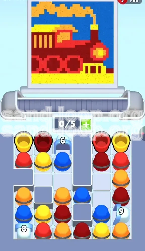 - Dense Color Volume: The Maroon (Dark Red) color required for the train body accounts for approximately 45% of the total sand volume. You must prioritize this immediately or risk getting bottled up.