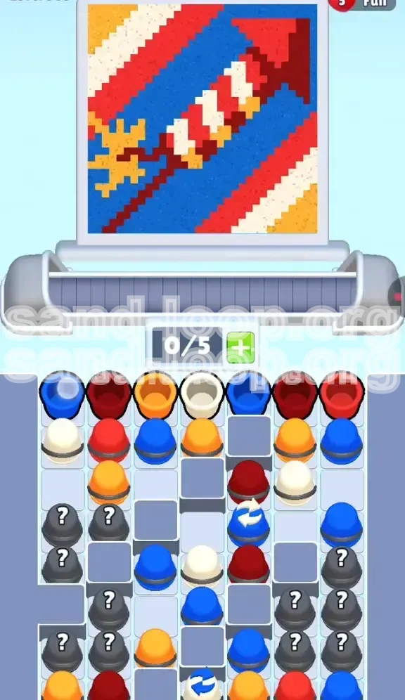 Welcome to the ultimate strategy guide for Sand Loop Level 305. This level is a significant hurdle for many players, shifting the focus from raw speed to precise resource management and prediction. In this stage, you are tasked with painting a pixel-art Firework Rocket launching diagonally across a blue sky. While the image seems simple, the level is complicated by a "Mystery Cup" mechanic that hides critical resources, forcing you to play a game of memory and probability rather than just reaction.