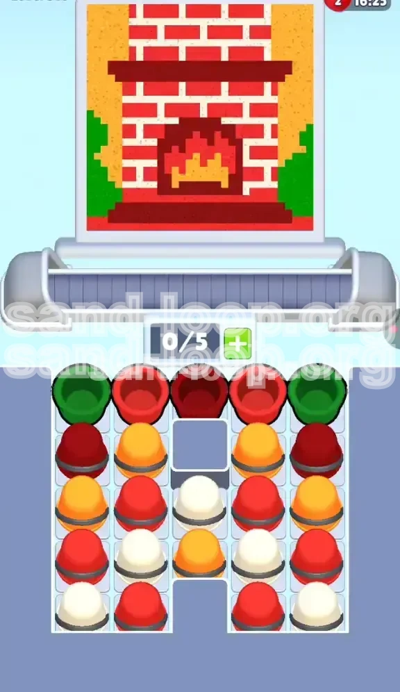 Welcome to the Brick Fireplace challenge in Sand Loop Level 316. This stage presents a unique blend of visual aesthetics and logistical puzzle-solving. Unlike previous levels that might have relied on quick reflexes, this is a pure logic and inventory management test. The goal is to paint a pixelated brick fireplace, complete with a roaring fire, bushes, and a mantel. The difficulty arises not from the complexity of the image, but from the rigid, U-shaped structure of the cup dispensing tray.
