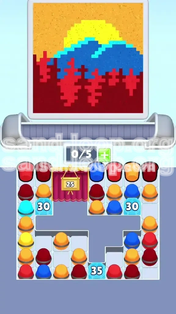 The "35" block at the bottom center is the final gate. It usually guards the bulk of the Yellow cups required for the sky. A common mistake is breaking this too early. If you flood your tray with Yellow cups before you have finished the Dark Blue mountains, you will have no space to process the necessary Blue sand. You must time the breaking of this block to coincide with your transition to the top section of the painting.