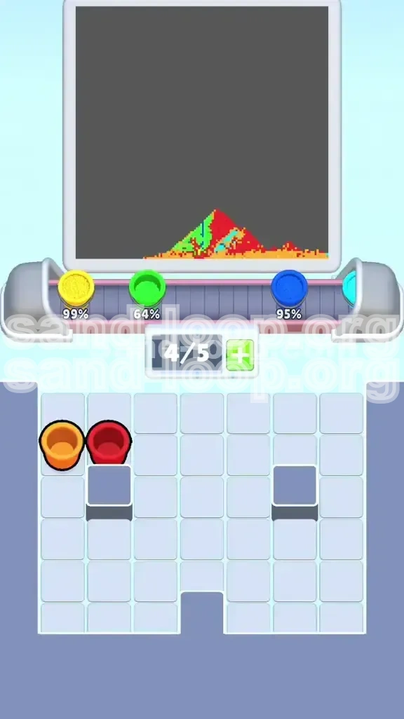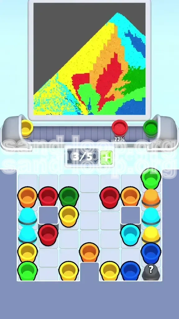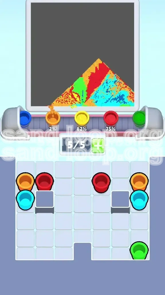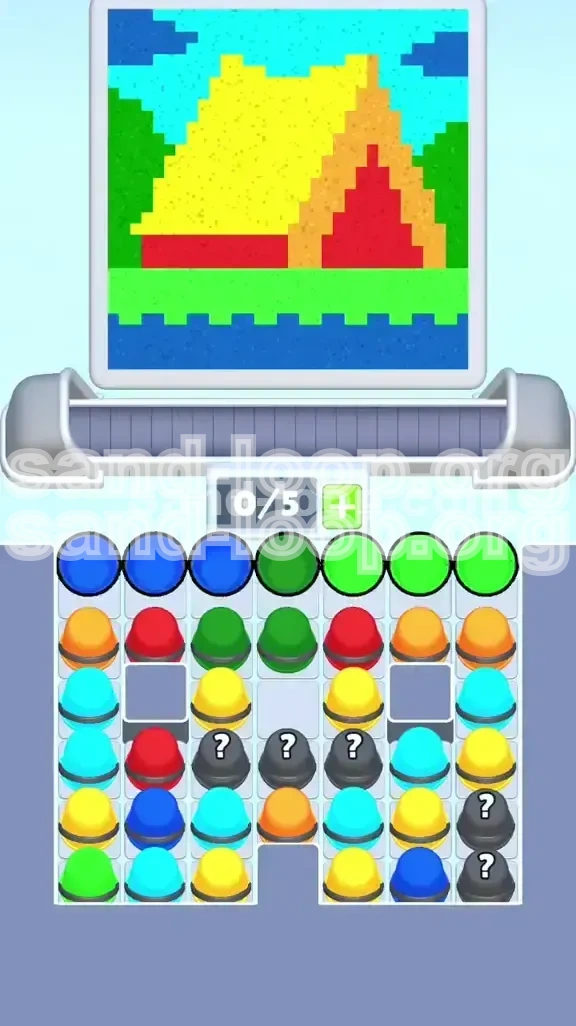 Level 369 is not a test of reflexes; it is a masterclass in fluid management and spatial reasoning. The core mechanic of Sand Loop dictates that liquids flow based on gravity and pixel collision. In this level, the game generates a scene featuring a cabin, a shoreline, and a sky. Your input comes from a supply tray (a grid of color cups) and a processing belt (a 5-slot queue). The challenge arises because the supply tray is organized inversely to the painting order: the colors you need last are stacked on top, blocking access to the colors you need immediately.