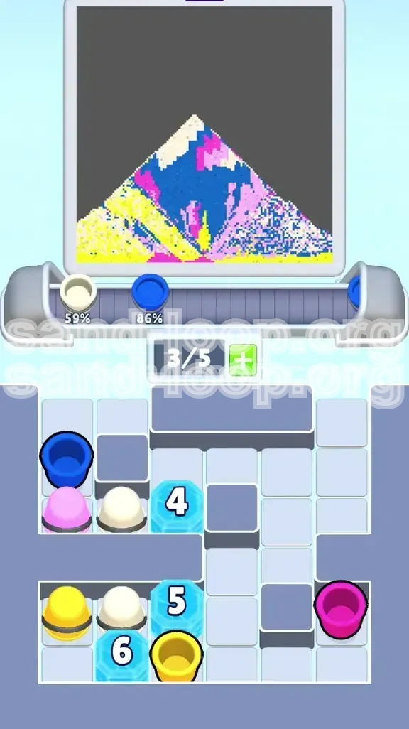 - The Result: The Blue sand overflows into the Pink eye sockets or the Yellow moon.