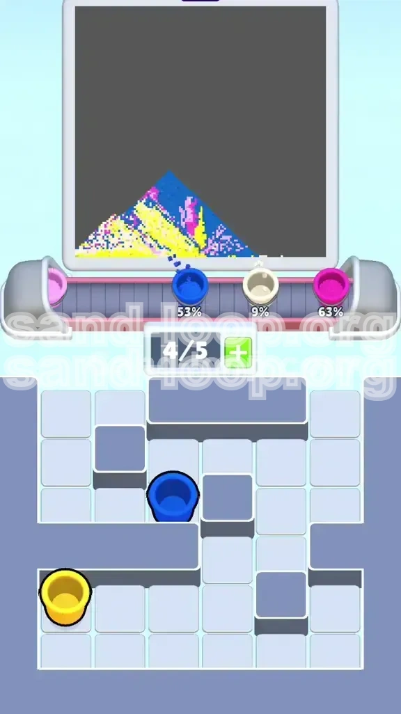 - Walling: Build Yellow walls to contain the Blue sand. This allows you to pour faster without needing pixel-perfect aim.