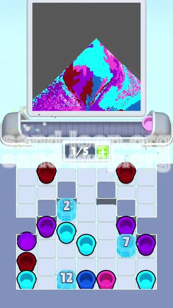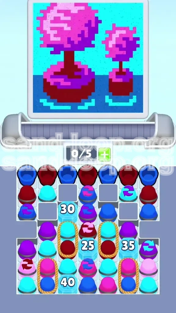 Welcome to the definitive walkthrough for Sand Loop Level 386. This stage is a deceptive masterpiece of pixel art logic that presents a serene visual of pink trees floating on blue water, while hiding a brutally restrictive puzzle mechanic underneath. Unlike standard levels where you simply match colors to paint, Level 386 is a resource management battle against high-value ice blocks and restrictive rope knots.