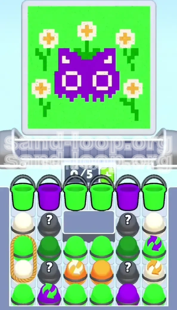 - The Flood Effect: Because you filled the Purple cat, the White petals, and the Orange centers first, those areas are "sealed." The Green sand will flow over the top, hitting the empty background spaces, and sliding off the filled details.