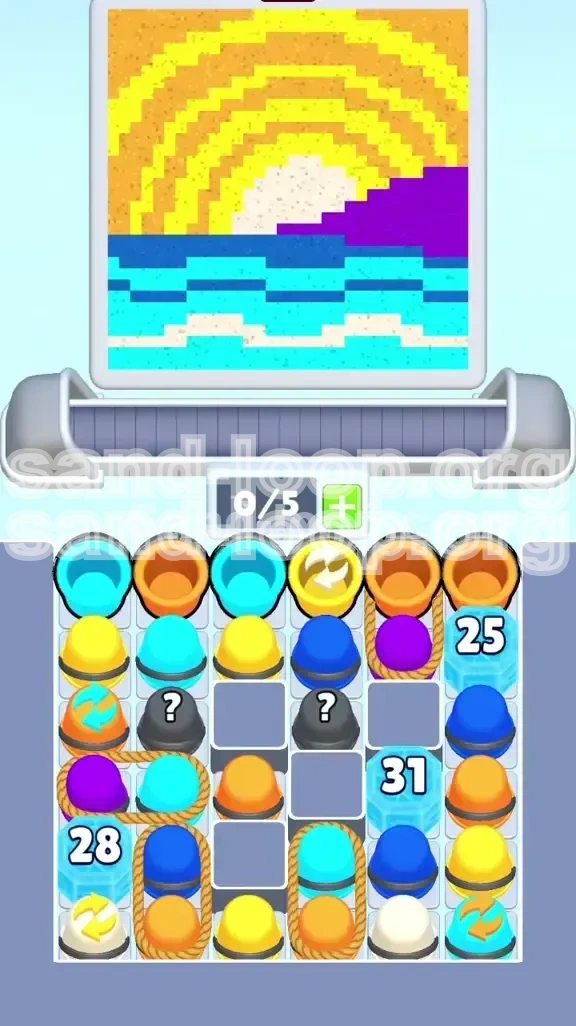 The primary challenge lies in the supply tray. Three massive Ice Blocks (numbered 25, 31, and 28) dominate the lower half, effectively walling off your color supply. You cannot simply grind through this level; you must solve a specific unlock order to access the necessary sand colors. Additionally, the "Danger Zones" are the thin white and cyan wave lines at the bottom of the canvas. These require surgical precision, as overfilling them with sand will cause immediate cross-contamination and level failure.