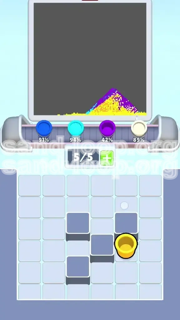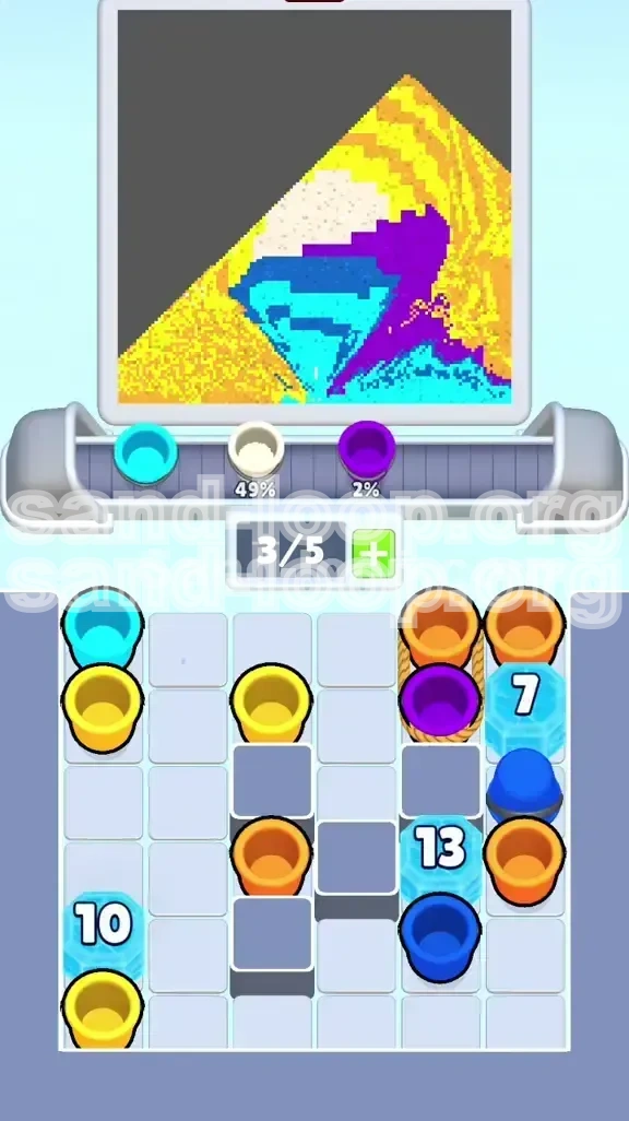 - Option A: The Small Fill. Look for tiny, insignificant pixels on the canvas that match your junk colors (Yellow). Pour them there just to clear the queue slots. It wastes a little sand, but it buys you 2 slots of freedom.