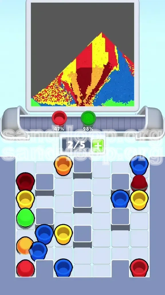 Keep your belt at 80% capacity (4 out of 5 slots filled) at all times during the "Ball Phase." This sounds counter-intuitive, but a fuller belt means your cups are closer to the nozzle. The travel time for a cup from the back of the belt (Slot 5) to the pouring point is longer than from Slot 1. By keeping the belt full, you ensure a constant stream of sand is hitting the canvas. You must be incredibly skilled to avoid deadlock at this capacity, but it is the fastest way to complete the level.