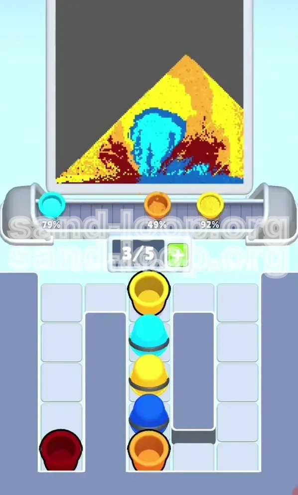 This level introduces a hard "Lock and Key" mechanic combined with a strict layer-based painting order. Unlike previous levels where you could pick colors at random, this stage forces a linear path: you must paint the background before you can even access the tools to paint the foreground. If you ignore the physics of the conveyor belt and the layout of the tray, you will find yourself stuck with a full belt of useless sand and no way to unlock the critical red color.