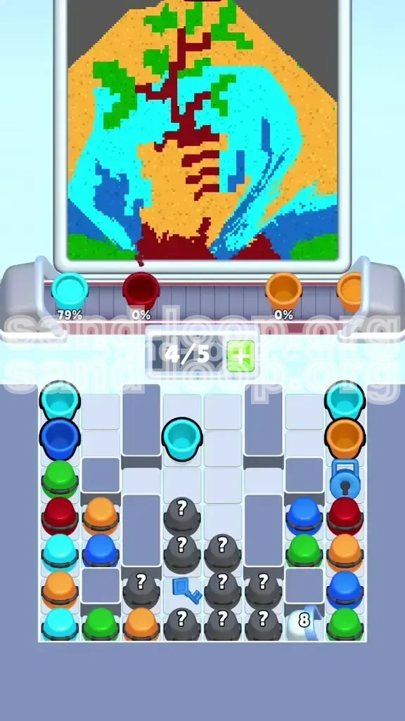Unlike standard grid puzzles, this level utilizes fluid dynamics for the sand pouring. If you pour light-colored sand (Yellow or Cyan) next to an unfinished dark area (Green or Dark Blue), the light sand will "bleed" over the boundary lines. This is particularly problematic for the Red stem of the plant, which is often only one pixel wide. If the background is poured before the stem is fully solidified, the stem will disappear into the background colors.