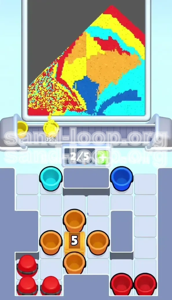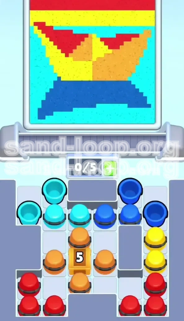 The core difficulty here lies not in the dexterity of your fingers, but in the capacity of your brain to manage a strict inventory system. You are operating under a 0/5 Slot Limit. Every single cup you tap creates a 3-second delay before the sand even hits the canvas. If you mismanage this queue, you will create a bottleneck that leads to an automatic fail. This guide will break down every step, color decision, and trap you need to navigate to clear this stage efficiently.