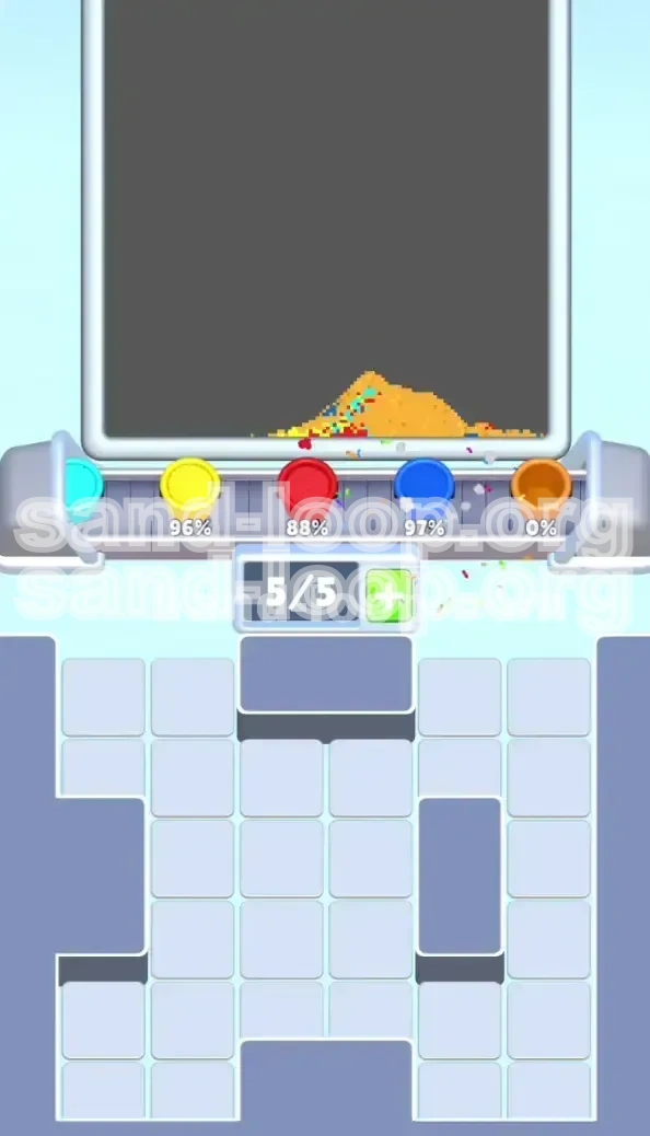 - The Solution: The game is generous here. Look for a color that matches the general area (e.g., use Orange for a small hole in the Red zone). Pour it slowly. The sand will "bleed" into the hole and count as complete. You don't need perfect color matching for the final 1-2%.