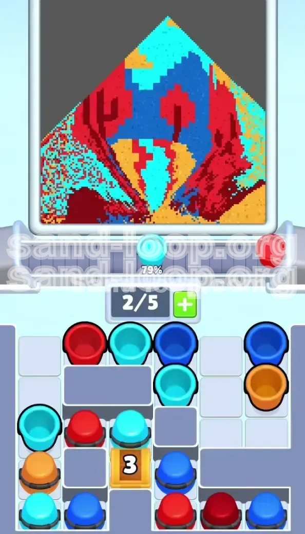 - The Slot Economy (0/5 Capacity): Your conveyor belt has a maximum capacity of five items. Once a cup enters the belt, it stays there until 100% of its sand is poured onto the canvas. If you fill all 5 slots with "wrong" colors (e.g., background colors needed later), you cannot process the cups you actually need right now. You will be stuck watching a full belt, unable to interact with the board.