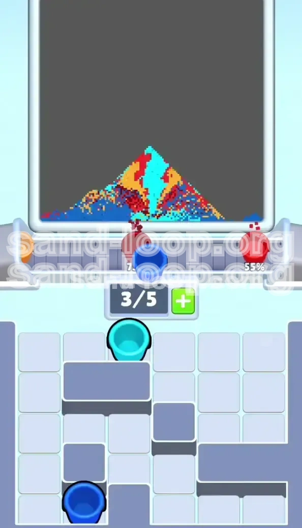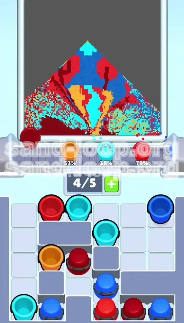 - Color Separation Integrity: The Cyan river must remain pristine. If even a single grain of Bright Red or Dark Blue falls into the main river channel, your accuracy score will plummet, likely failing the level.