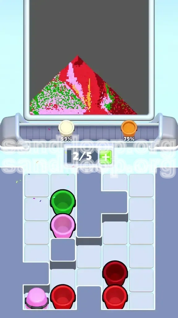 The Consequence: You fill your 5-slot belt with Red. The canvas needs Green or White to proceed, but those cups are trapped behind the crate. The Red cups pour, turn into "sand piles" on the canvas that don't match the target, and the belt stalls.