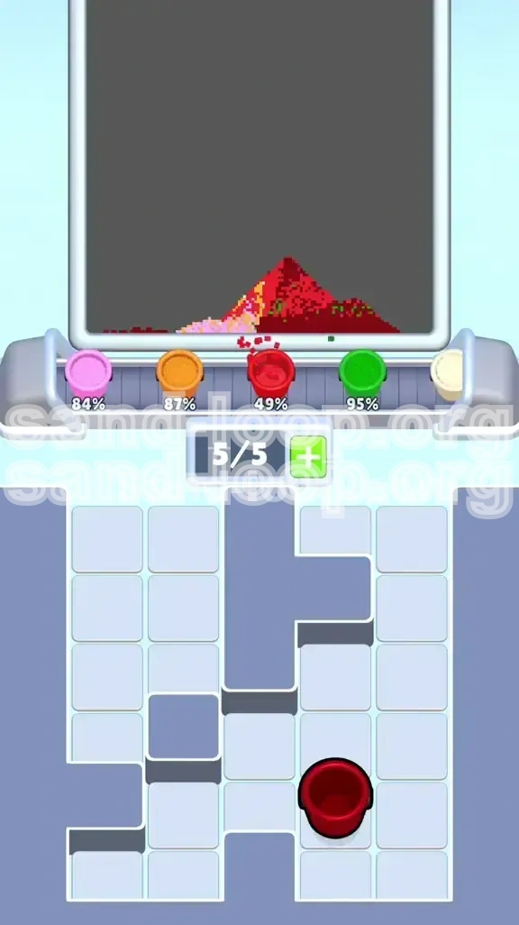 - Placement: The Orange sand needs to sit on top of the Dark Red base. If you pour Orange too early, it will mix with the Red base. Ensure the Dark Red layer is established first.