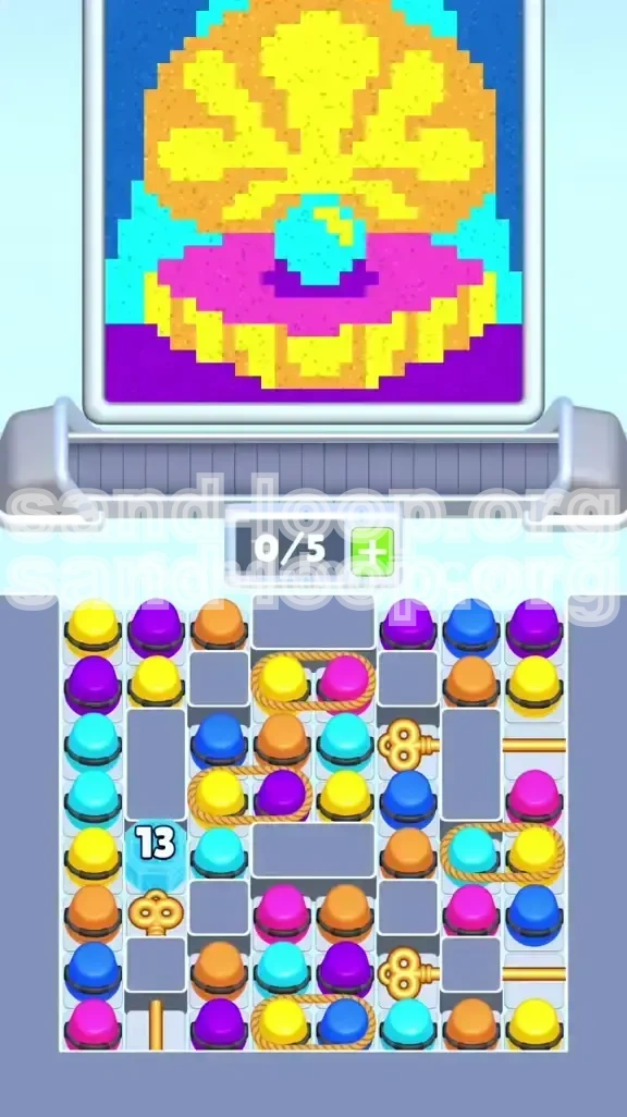 Sand Loop Level 504 is not a test of how fast you can tap; it is a strict examination of your ability to manage logistics and execute a color sequence with surgical precision. In this stage, players are tasked with assembling a detailed pixel art illustration of a giant Clam holding a pristine Pearl. The difficulty lies in the "Zero-Sum" resource management system imposed by the level design. You are given a severely restricted supply tray and a conveyor belt that acts as a ticking time bomb. With a massive 13-hit Ice Block obscuring your vision and locking up critical colors, and complex Golden Key mechanics pinning your essential supplies, one premature tap can cause a cascade failure that renders the level impossible to complete. This guide is designed to navigate you through these logical chokepoints, ensuring a three-star finish.