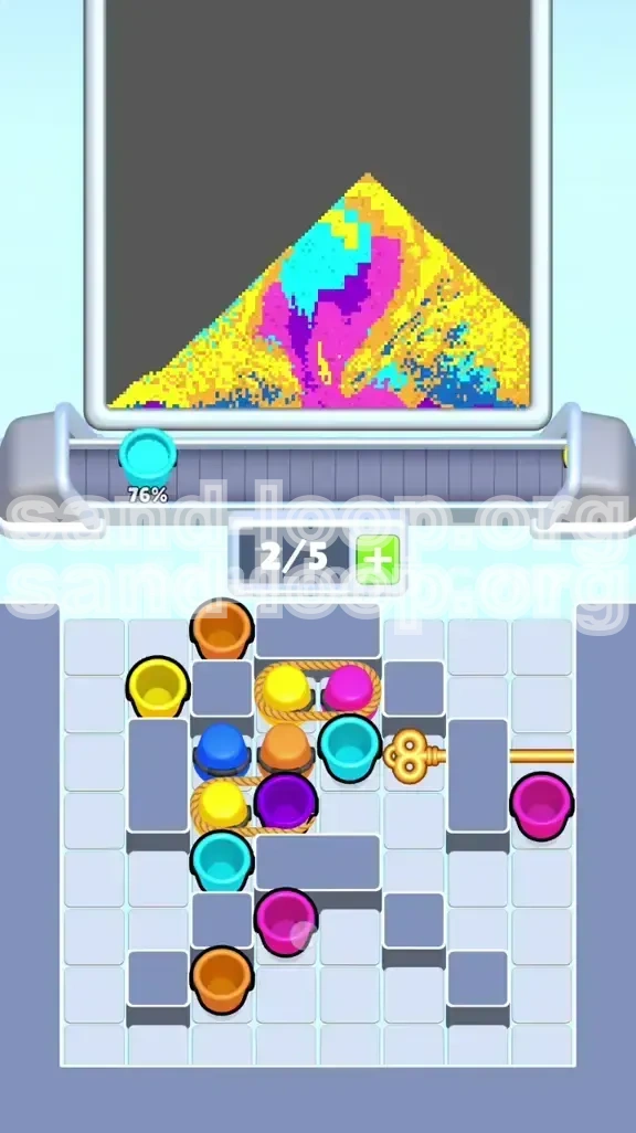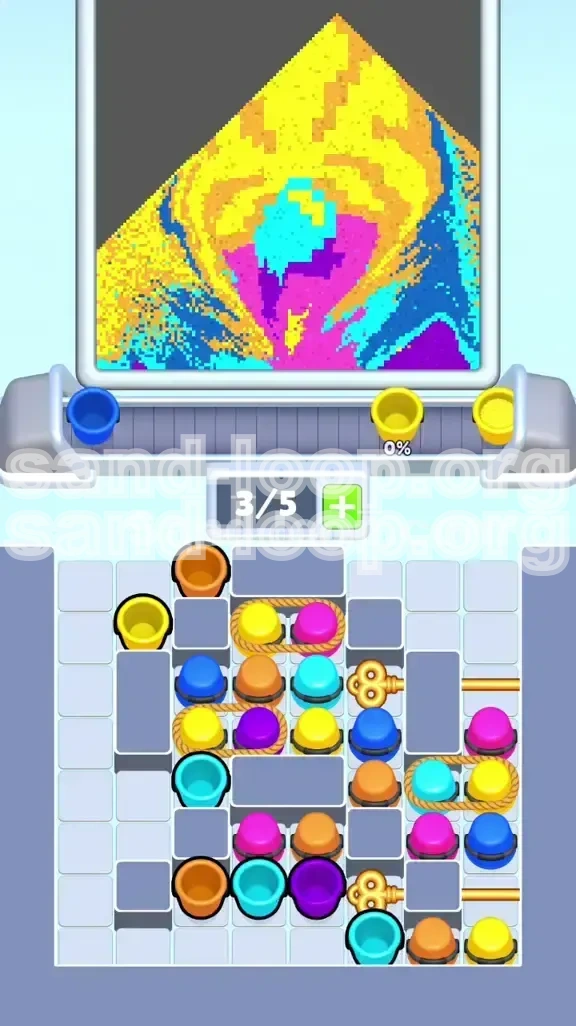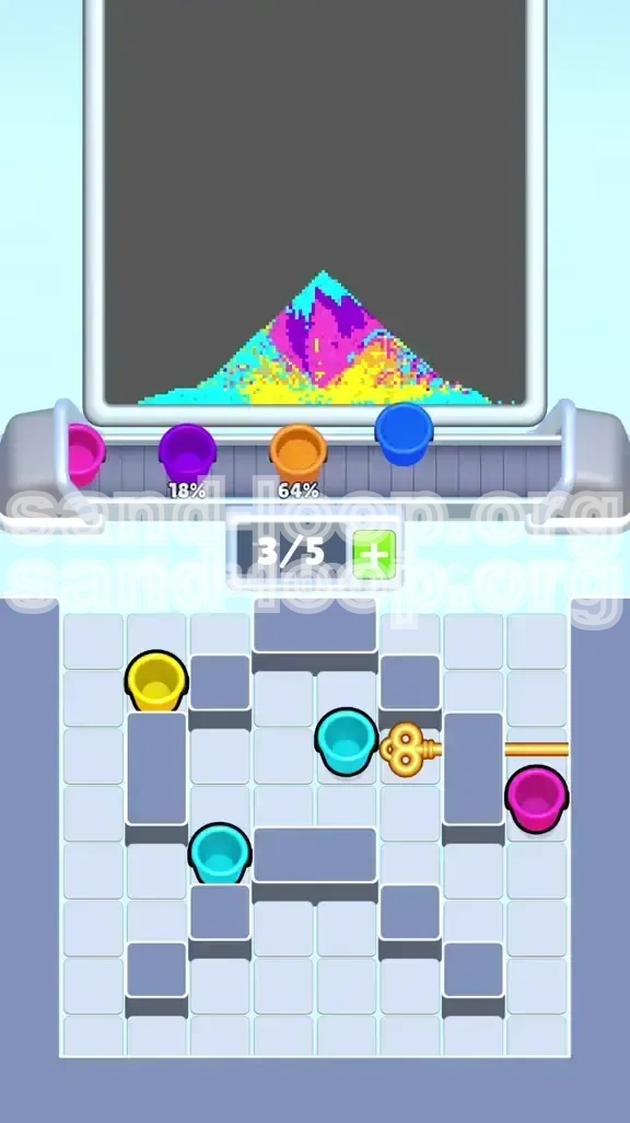 - The Drop: Tap the Cyan cups. The blue sand will land on top of the pink Magenta bed. Because the bed is raised, the blue sand stays localized, forming the perfect "Pearl" pixel art.