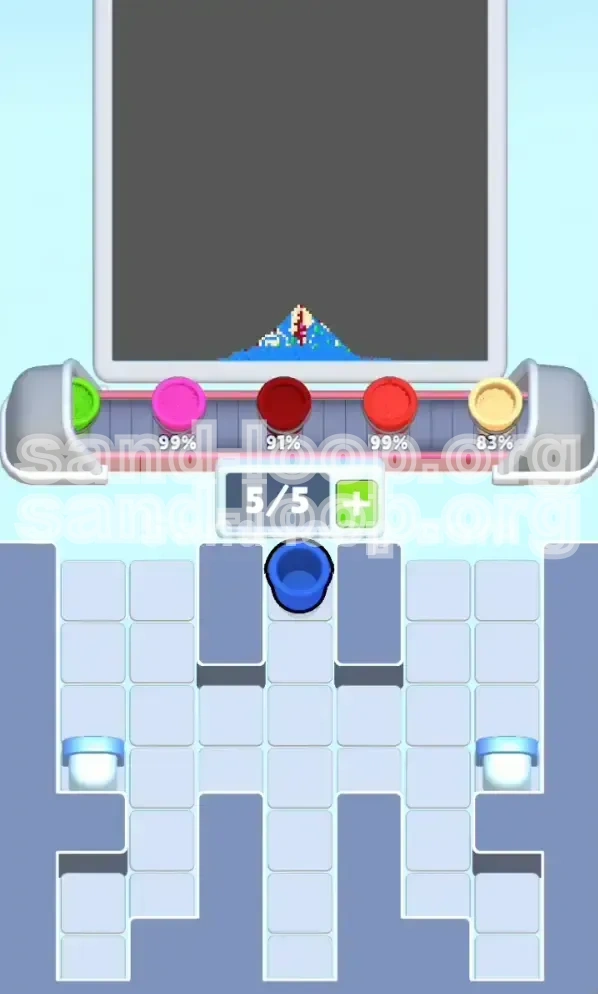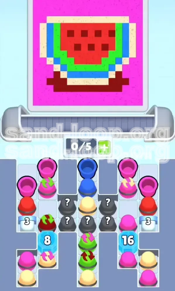 Sand Loop Level 74 is not just a puzzle; it is a test of your ability to manage limited space under pressure. The level features a complex, symmetrical pixel art design set against a vibrant magenta background. Visually, the canvas is divided into distinct regions requiring Red, Green, Blue, Cream, and Dark Brown. The high contrast between the background and the foreground elements means that "bleeding" colors—accidentally pouring sand into an adjacent area—will visually ruin the symmetry and likely result in a failed attempt. The design is dense, leaving very little empty buffer space between color zones.