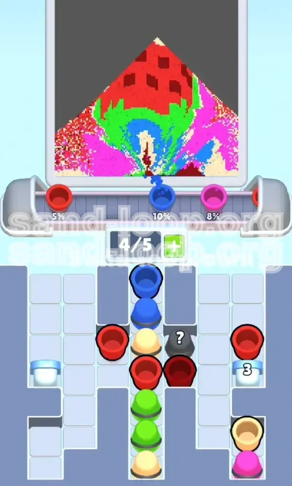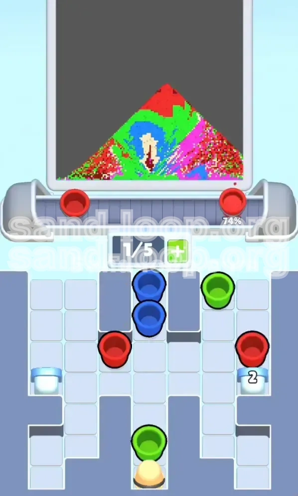 These three colors form the backbone of the image and account for approximately **75% of the total sand volume**. You must process them in a rotation: Red -> Blue -> Magenta. Do not focus on one until it is finished; instead, keep their progress bars relatively even. If Red is at 80% and Blue is at 40%, stop loading Red immediately. An unbalanced progress bar is the number one cause of game overs in Level 74 because it forces you to desperately hunt for a specific color while the timer ticks down.